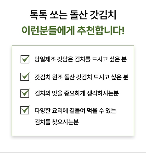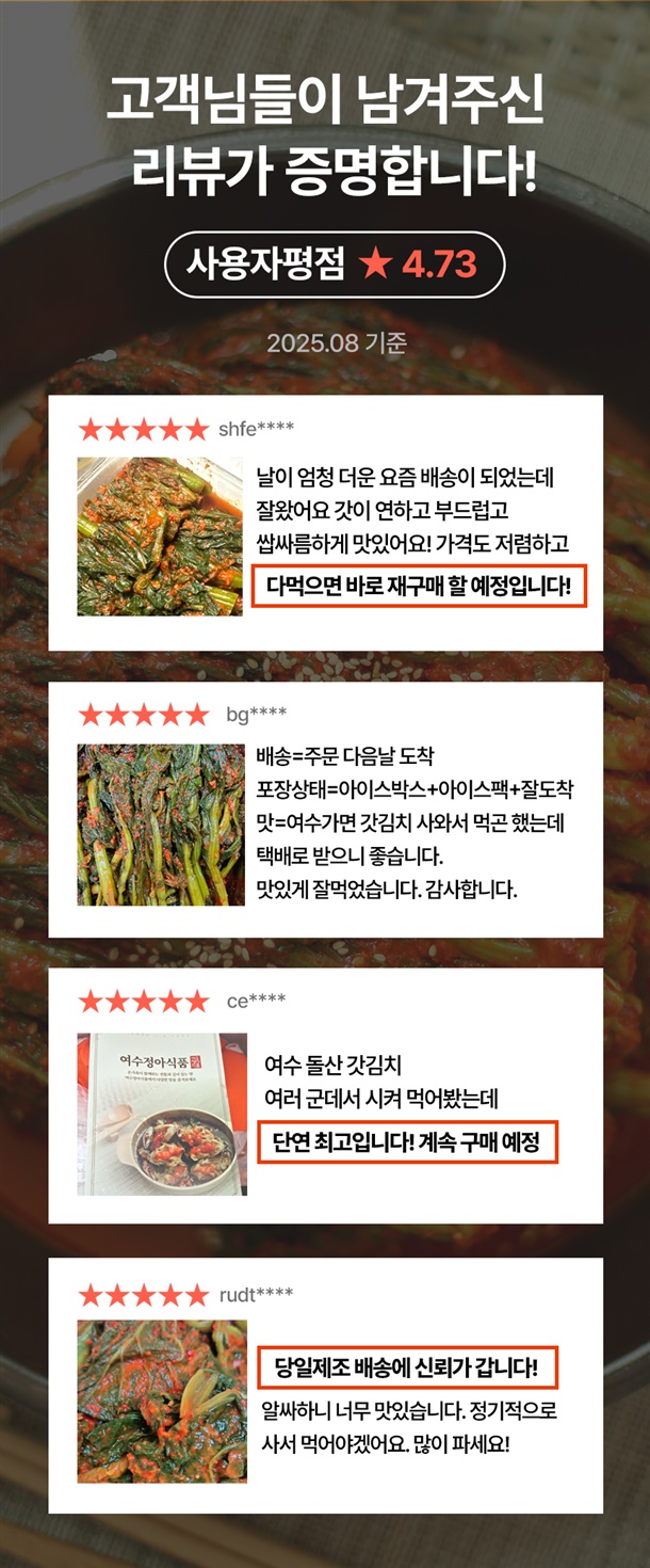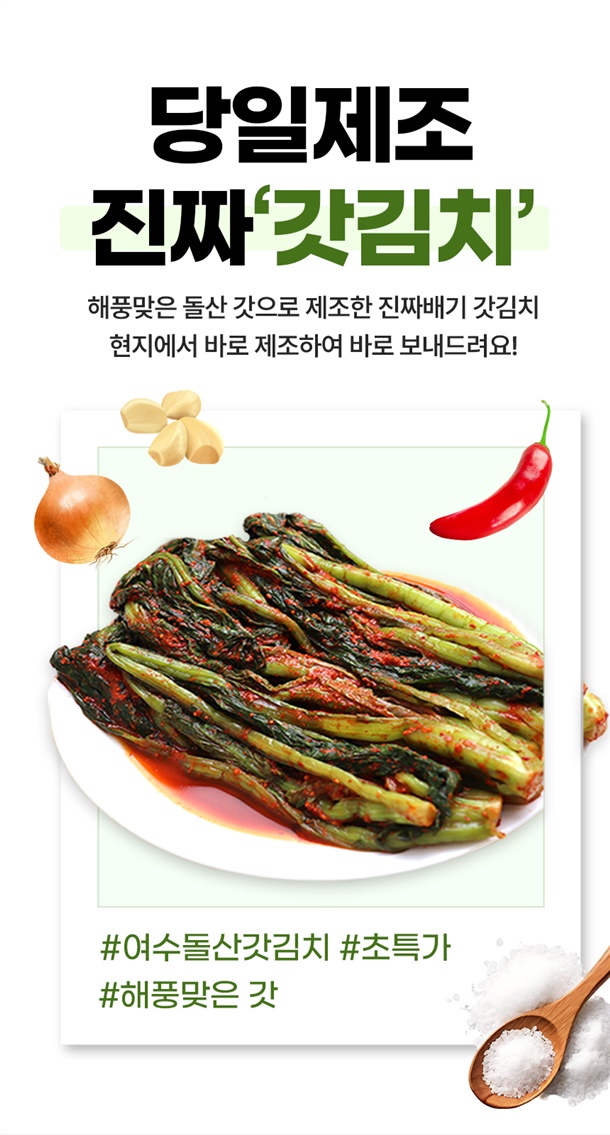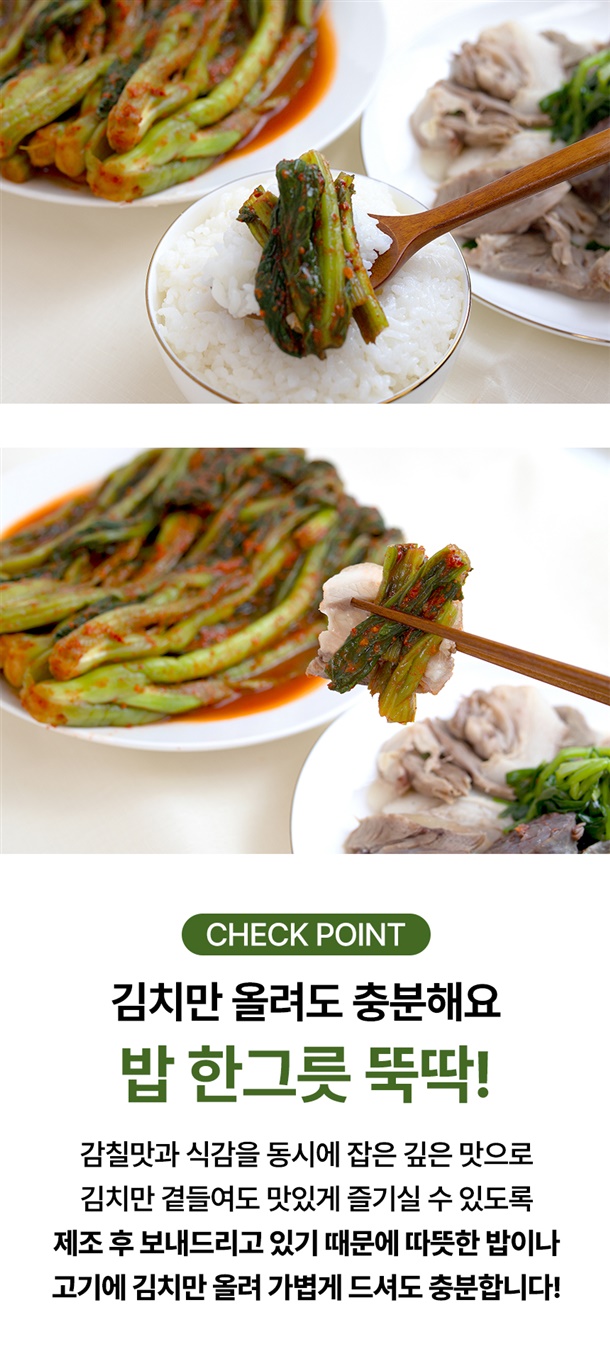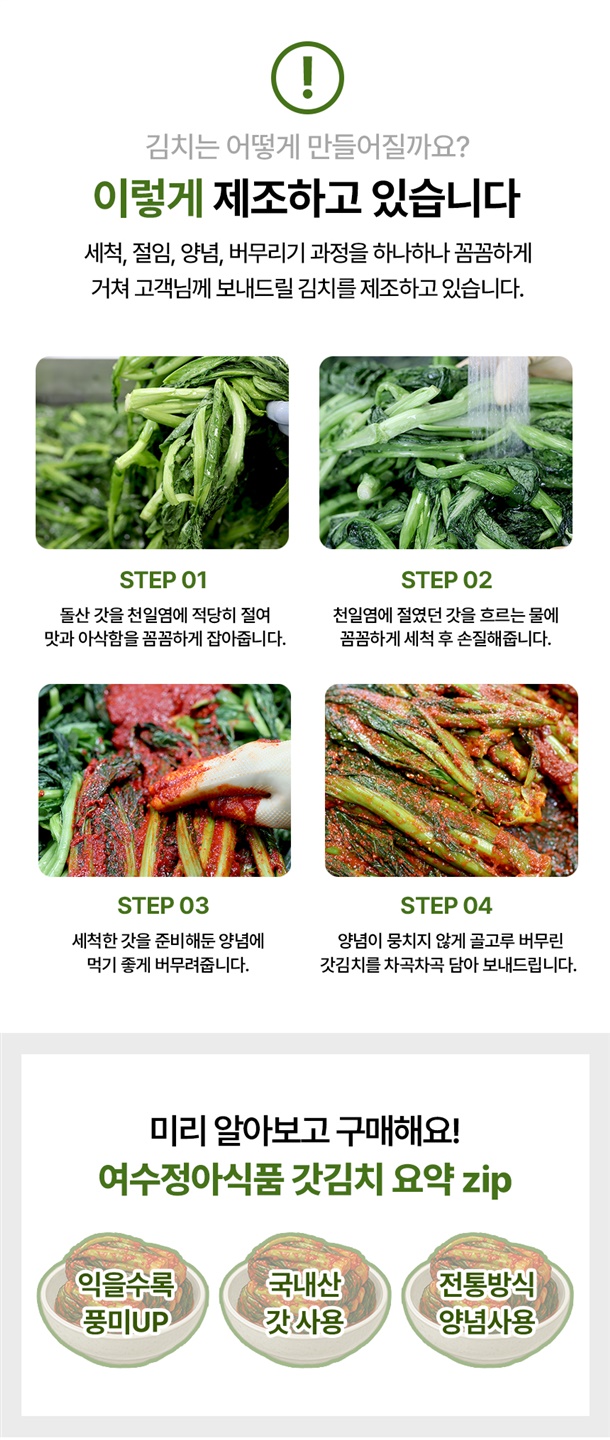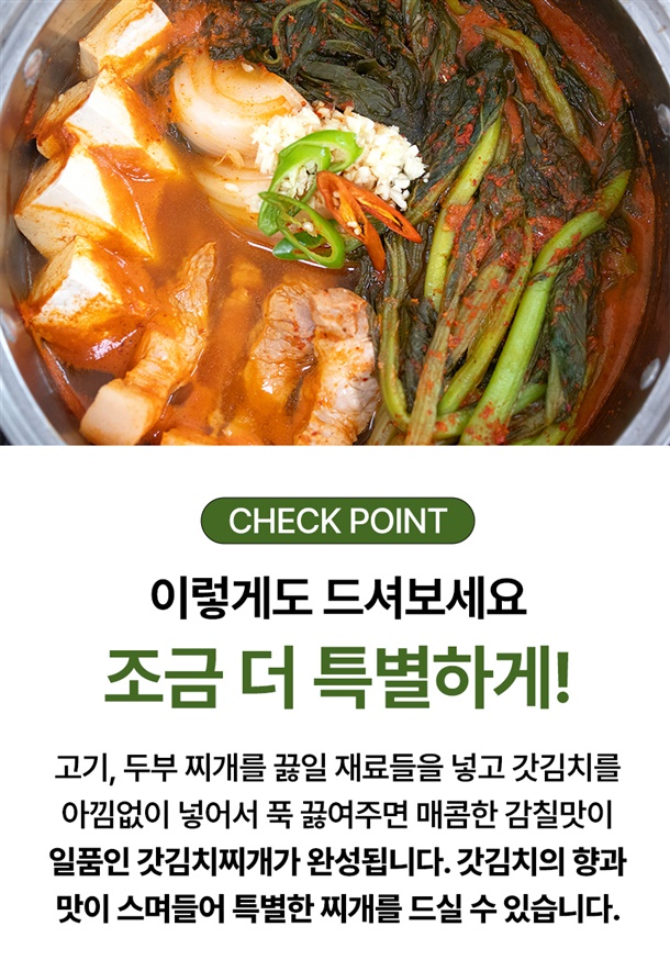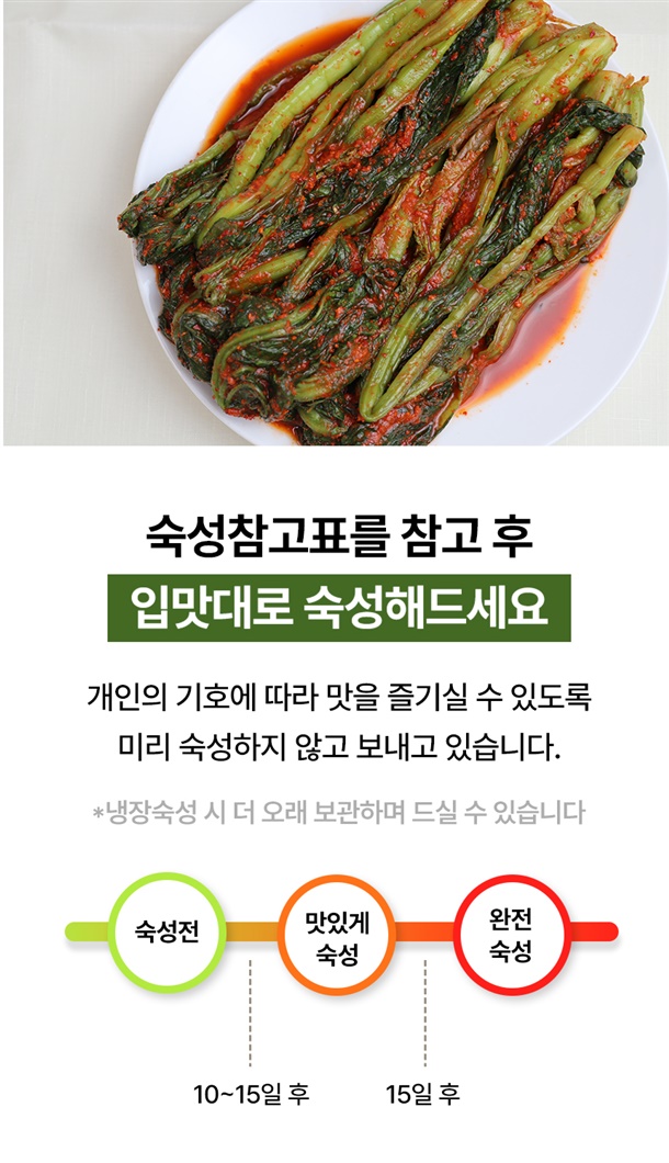 재주문인데 갓김치는 한 1주정도 익혀야 제맛입니다 (지극히 개인입맛) 맛있어요