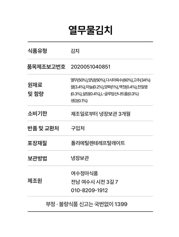 원산지 열무 - 국내산 , 고추가루 - 국내산