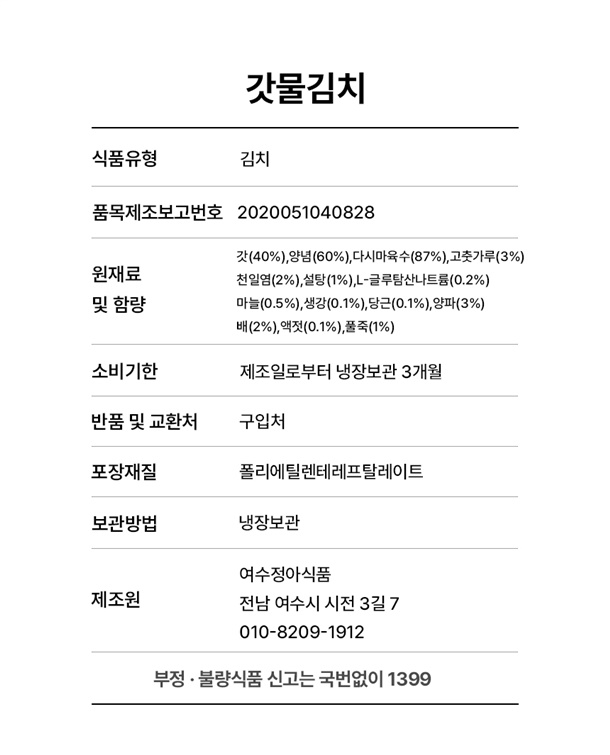 3. 농수산물의 원산지 표시에 관한 법률에 따른 원산지 | 갓김치-국내산 , 고추가루-국내산 |