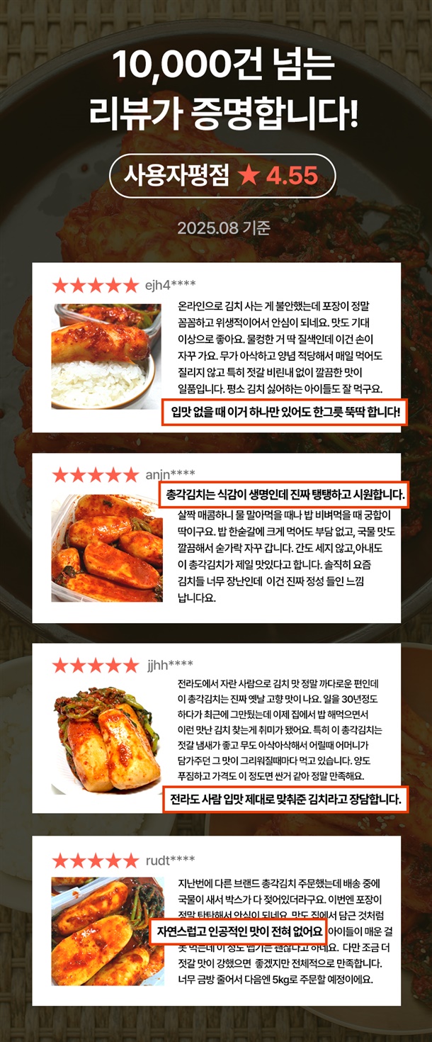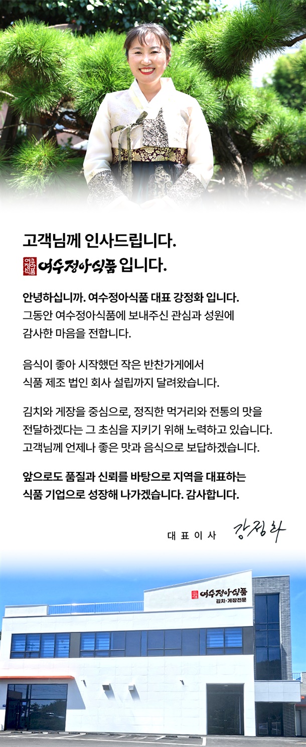 광고보고 먹음직스러워 망설임없이 바로주문 3일연휴가껴서 다음날 바로 받아보았어요 대박~^^ 광고 그대로 총각무김치맛이 끝내줘요 당일 담거서 보내주어서 살짝 덜익었으나 그래도 힌입 맛있게 먹었어요 여수정아식품 총각김치 짱 이에요 다먹고 갓김치포함해서 재주문 해야겠어요 감사합니다 ~^^