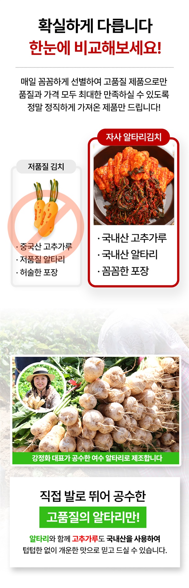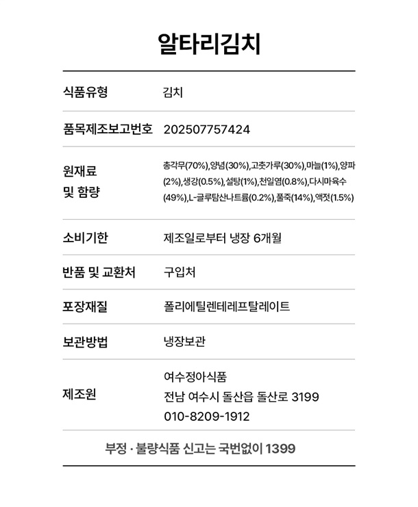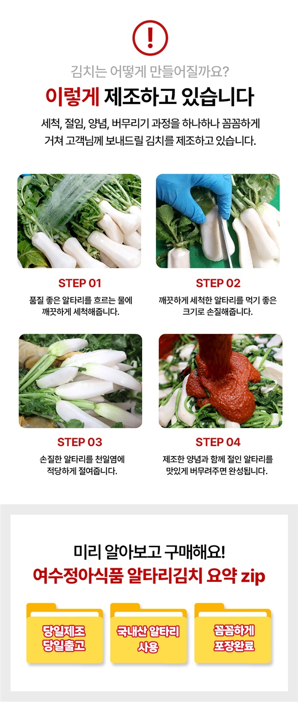 포장도 이중으로 꼼꼼하게 해서 왔으며 무엇보다도 알타리 김치가 짭지도 않고 삼삼한게 맛이 좋아 재주문했습니다.