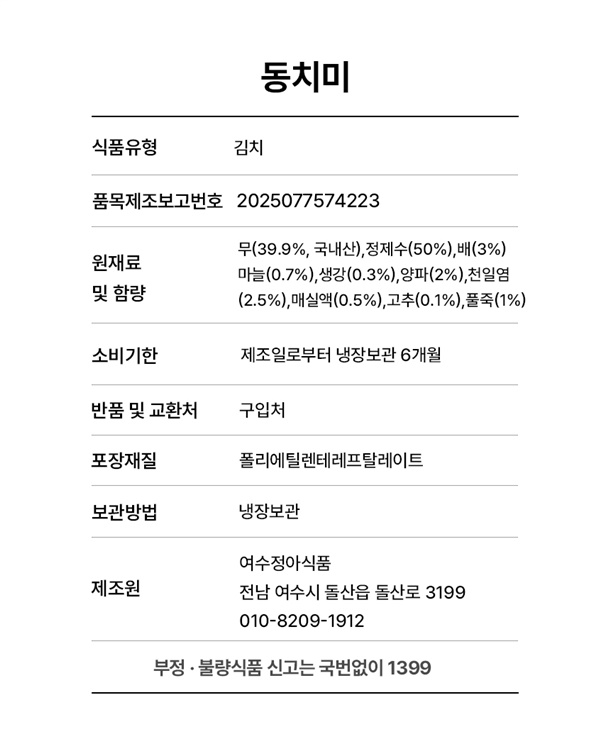 2. 생산자, 수입품의 경우 수입자를 함께 표기 | 여수정아식품 |